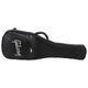 Das Kunstleder sieht echt gut aus in natura, beim bestellen war ich mir da nicht sicher. Die Verarbeitung ist über jeden Zweifel erhaben. Die Reissverschlüsse gehen smooth von der Hand, und lassen sich mittels grosser mit Logo versehenen Zipverlängerer gut bedienen. Der Handgriff ist dick und macht einen satten Eindruck. Die Sidepockets sind nicht übermaessig gross, aber für Kabel, Noten, Stimmgerät und kleines Zubehör ausreichend. Das Innenleben ist ebenfalls sehr schön, schwarzes weiches Futter und ein gebrandeter Klettverschluss, der den Hals der Gitarre gut hält. Das Padding ist rundherum wirklich schön dick, und man hat ein gutes Gefühl, wenn mein sein baby damit transportiert. Die Tasche liegt angenehm am Ruecken, die Riemen sind Breit und gut gepolstert, die Verschlüsse wirken ebenfalls gut verarbeitet. Der Reflektor sitzt an der Vorderseite der Schulter, was eine ästhetische Höhe imho ist. Rein passt meine Sg, lt Gibson auch die Paula. Auch eine telecaster hat gut Platz, wenn man das will😉.